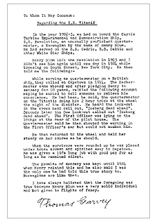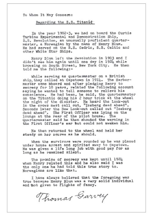 "In this book Don raised an interesting possibility: that Robert could have been ‘spirited away’ to South Africa by the ‘White Star Line, who owned Titanic, in a bid to keep him silent about what he had witnessed that night at the wheel. I wrote to Don to ask him about what he had written and not only did he reply and go on to help me a great deal, but he sent me the astonishing letter shown overleaf which provided him with this information. The letter was written by a man called Thomas Garvey and was given to Don by Garvey’s daughter, after his death in 1982. Too much time has passed for anyone to know whether Thomas Garvey tried to get this information to other people during his lifetime, and it appears that, to date, only three people have seen it." (51.)