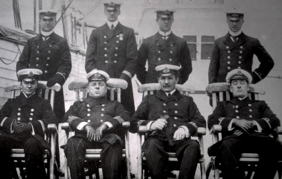 Olympic's officers in summer white uniforms. Murdoch stands second from the right. (8.) (Click image to enlarge)