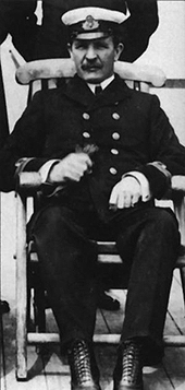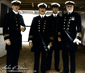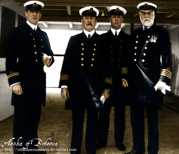 In the above photographs we see a clear full body shot that reveals him to be tall, lean and a modest gentleman. Note Murdoch has two strips on his sleeve, marking him as First Officer, while Smith has four, as Captain. Regarding this photograph, Elizabeth Gibbons writes: