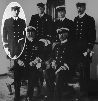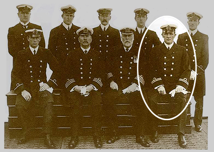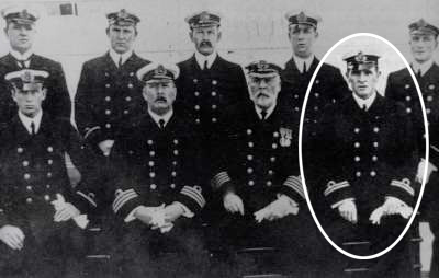 Olympic's officers. Standing: Standing: Purser Hugh McElroy 3rd Officer Henry O. Cater, 2nd Officer Robert Hume, 4th Officer David W. Alexander, 6th Officer Harold Holehouse. Seated: 5th Officer Alphonse Martin Tulloch, Chief Officer Joseph Evans, Captain Edward John Smith, and 1st Officer William McMaster Murdoch. (Click image to enlarge)