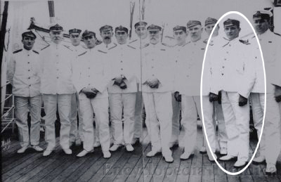 Olympic's officers seated in summer white uniforms, at lifeboat no.6. Murdoch is standing on the far right. (8.) (Click image to enlarge)
