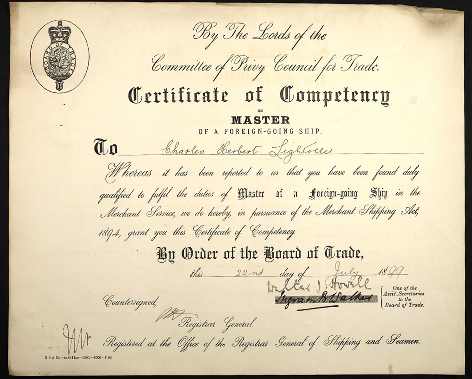 Lightoller's BOT certificate for Master, in 1899. (Click image to enlarge)