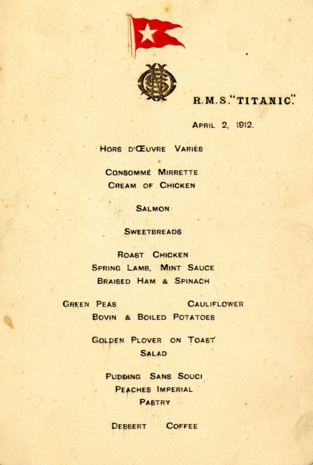 Titanic's sea trials, abbreviated due to weather conditions, took place on the 2nd of April, 1912, during which Lightoller was stationed at the after end of the ship. According to a menu Lightoller kept as a souvenir, the senior officers enjoyed a lunch including consommé mirrette, sweetbreads and spring lamb. He later gave the menu as a gift to his wife, Sylvia, when he left Southampton on 10 April 1912. The menu was auctioned in 2003 when it sold for £28,000 at Sotheby’s, and had been consigned by Lightoller’s descendants, who said it had been given to his wife Sylvia as a souvenir as he departed from Southampton on April 10. In 2018 it was auctioned again and sold for a hammer price of £80,000, a record for a menu from the ship.