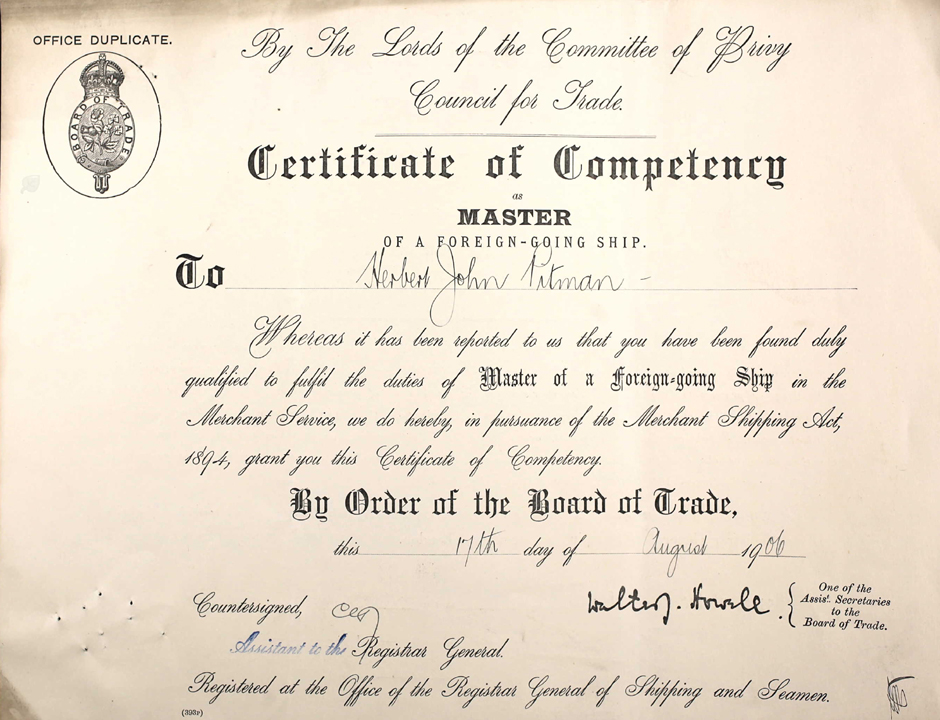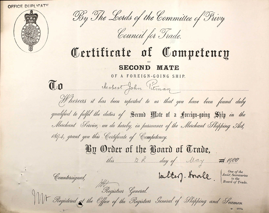 On the 10th of April 1900, Pitman applied for his second mate certificate in the port of Bristol, which was the closest port to his place of residence at the time, at Sandbrook, Galhampton Bath (Yeovil). Unfortunately he failed on the subject of navigation, and reapplied on the 17th of April 1900 to fail once again on navigation. He finally passed on the 7th of May 1900, with his second mate certificate issued 7 days later on the 14th of May 1900.
