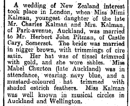 In June 1922 Herbert Pitman married Mildred "Mimi" Kalman from New Zealand. A marriage listing of June 1922 places the registeration in the district of Paddington, London. Mildred was born in October 1886, in Thames New Zealand and was the youngest daughter of Charles and his wife (also listed as Carl Simon Kalman and Marie Kalman) who lived in Park Avenue in Auckland. She is described in a newspaper article as being "married in nigger brown, with trimmings of cire satin. Her hat was of tinsel trimmed with gold, and she wore sables... Miss Kalman was well known in musical circles in Auckland and Wellington." (Marriage Notice - Evening Post, Volume CIII, Issue 152, 30 June 1922, Page 9)