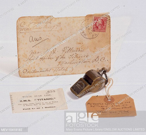 Stock photo of 1. The brass Thunderer whistle of HJ Pitman, 3rd Officer on the Titanic, with an inscribed label attached. 2. A Turkish Bath ticket. Source: Mary Evans Picture Library/ONSLOW AUCTIONS LIMITED (Click image to enlarge)