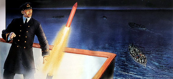 Artist impression of Boxhall firing rockets from a children's book (Artist Peter Dennis, from the book "Titanic - The Disaster That Shocked the World" by Mark Dubowski).