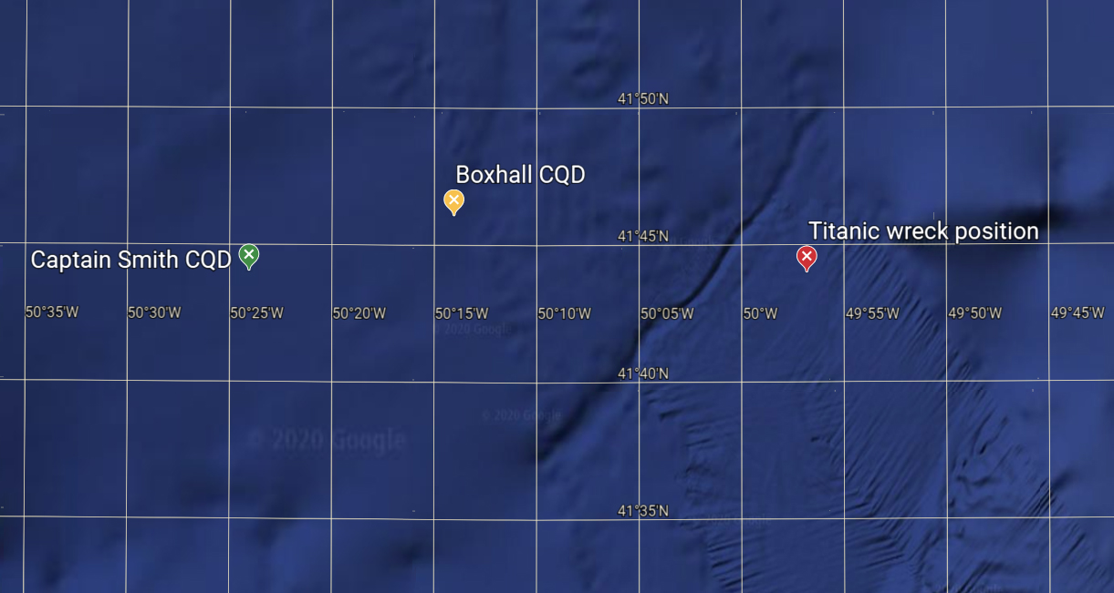 As it happened, with the discovery of the wreck, at 41º 43’ N, 49º 56’ W, we now know that both Captain Smith's and Fourth officer Boxhall's positions are respectively 20 miles and 13 miles too far to the west of Titanic's actual sinking position.