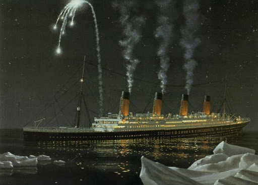 An artist's (Ken Marschall) impression of Titanic's distress rockets being fired from the starboard side.