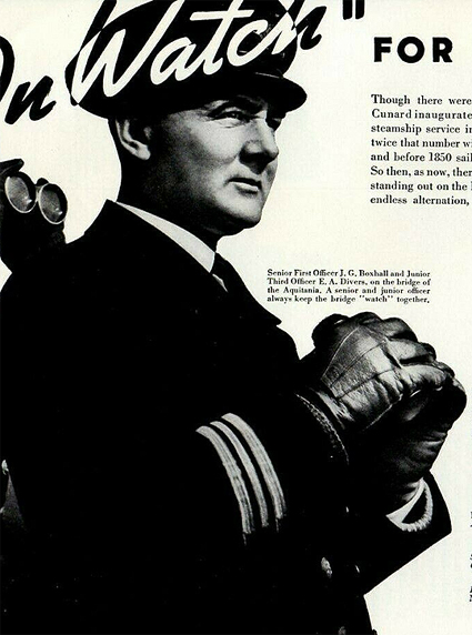 Cunard "On Watch" advertisement that appeared in 1937 featuring Boxhall.