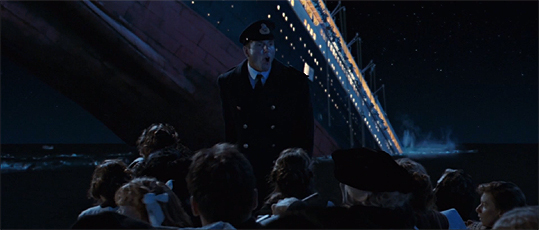 Simon Crane as Boxhall telling the occupants of lifeboat no.2 to "pull faster". The image is based on a painting by Ken Marschall, in which the open gangway doors can be seen in the background (below).