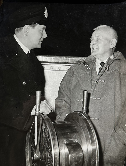 Joseph Boxhall meeting himself - the actor Jack Watling who plays Fourth Officer Boxhall, on the 16th of November 1957. (Credit: Dan E. Parkes collection)