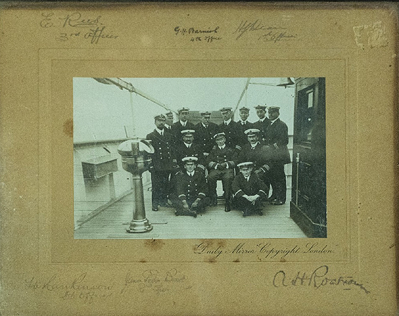 Lowe's copy of a signed photograph of the Carpathia officers and Captain Roston. Henry Aldridge & Son. (Click image to enlarge)