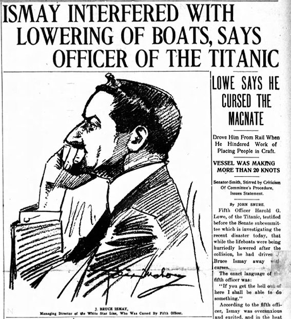 The Washington Times of 24th April 1912 runs a headline including "Lowe says he cursed the magnate" along with an artist's sketch of Ismay listening to Lowe's testimony.
