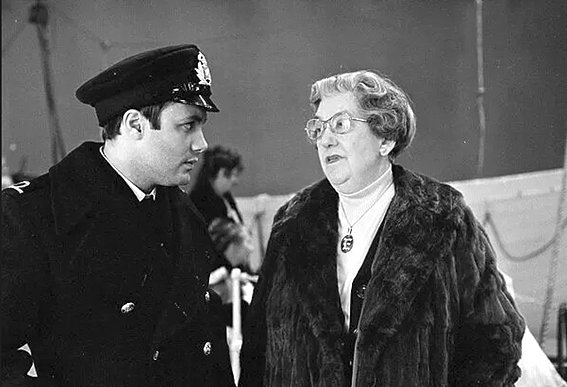 Eva Hart talks with actor Karl Howman on the set of S.O.S. Titanic (1979) during filming at Shepperton Studios.