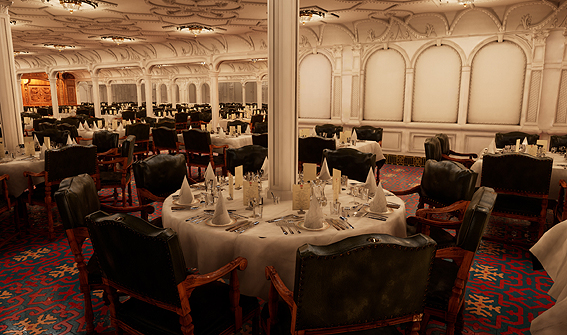 Chief Purser McElroy's eight seated table in the First Class restaurant, as portrayed in the Honor & Glory digital recreation of ths ship. (Click to enlarge)