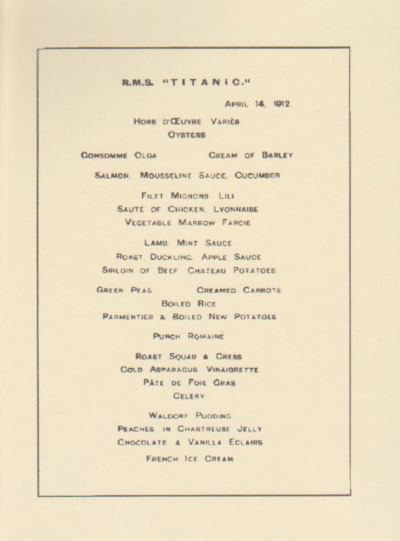 We can also get an idea of what McElroy and his dinner guests ate that night - based on a First Class menu from the 14th April 1912: