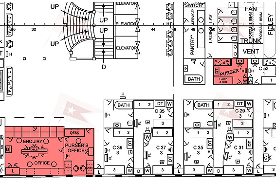Much must have been familiar to McElroy - just as aboard the Olympic, the Purser's Office was located on the C Deck landing of the Grand Staircase. He had his own unmarked cabin next door to C53.