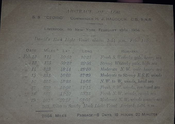 Haddock's Navy records list dozens of crossings between 28.4.1904 - 2.4.1907 for which he is listed as the Cedric's captain. For some of these voyages documents remain -such as an "Abstract of Log" of the S.S. Cedric dated February 10th, 1904 detailing the ship's progress between Liverpool and New York from the 11th of February to the 19th of February, a total of 2884 miles in 8 days, 19 hours and 22 minutes, arriving in New York at 4.06pm.