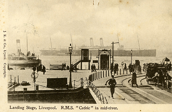 The RMS Cedric at the Liverpool landing stage in an undated postcard.